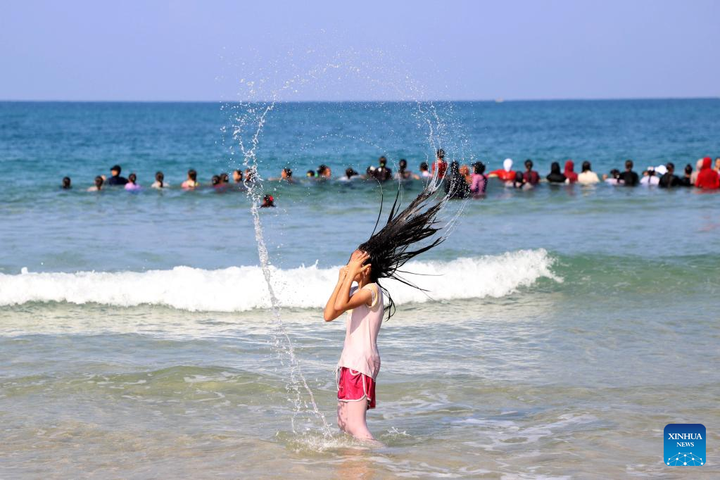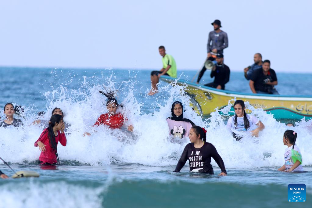 A Palestinian girl takes part in a swimming carnival in the Mediterranean Sea off Beit Lahia, northern Gaza Strip, on Nov. 3, 2022. (Photo by Rizek Abdeljawad/Xinhua)