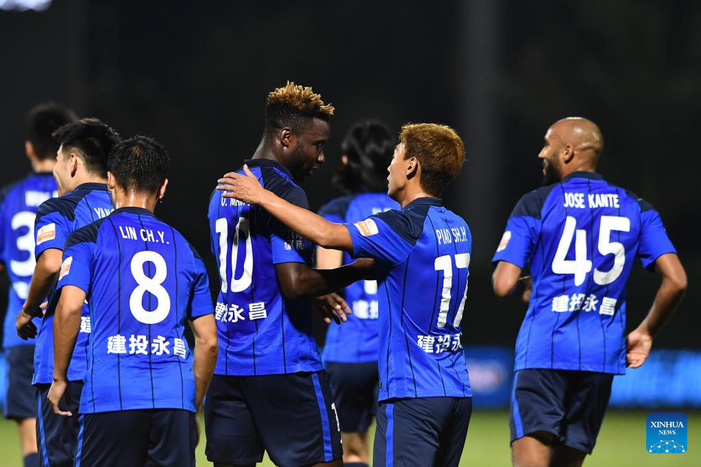 Oscar Maritu (4th R) of Cangzhou Mighty Lions celebrates scoring with his teammate Piao Shihao (2nd R) during a 2022 season Chinese Football Association Super League (CSL) match against Guangzhou in Haikou, south China's Hainan Province, Nov. 4, 2022. (Xinhua/Hu Zhixuan)