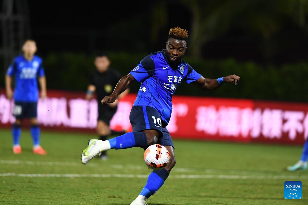 Oscar Maritu of Cangzhou Mighty Lions shoots during a 2022 season Chinese Football Association Super League (CSL) match against Guangzhou in Haikou, south China's Hainan Province, Nov. 4, 2022. (Xinhua/Hu Zhixuan)