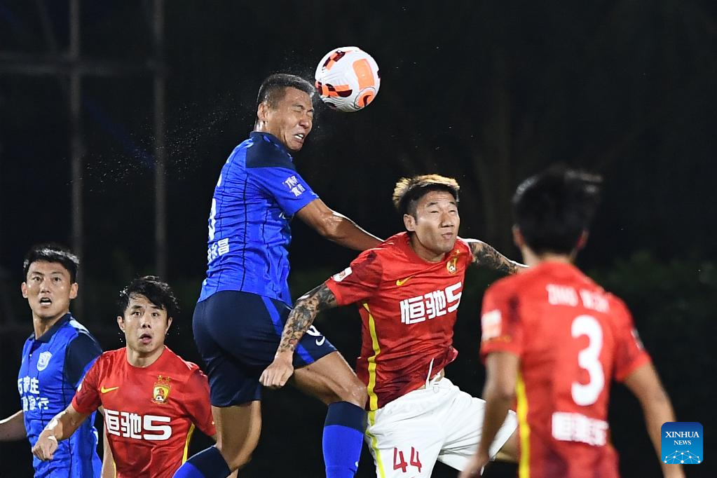 Yang Yun (Top) of Cangzhou Mighty Lions vies for a header during a 2022 season Chinese Football Association Super League (CSL) match against Guangzhou in Haikou, south China's Hainan Province, Nov. 4, 2022. (Xinhua/Hu Zhixuan)