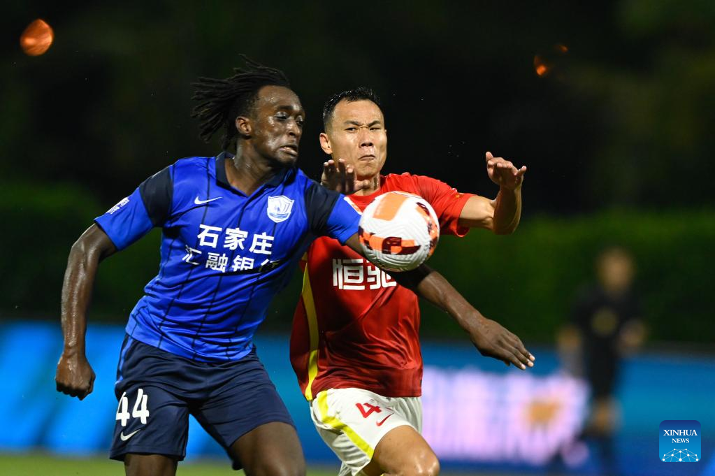 Oscar Maritu (1st R) of Cangzhou Mighty Lions vies with Zhao Wenzhe (2nd R) of Guangzhou during their 2022 season Chinese Football Association Super League (CSL) match in Haikou, south China's Hainan Province, Nov. 4, 2022. (Xinhua/Hu Zhixuan)
