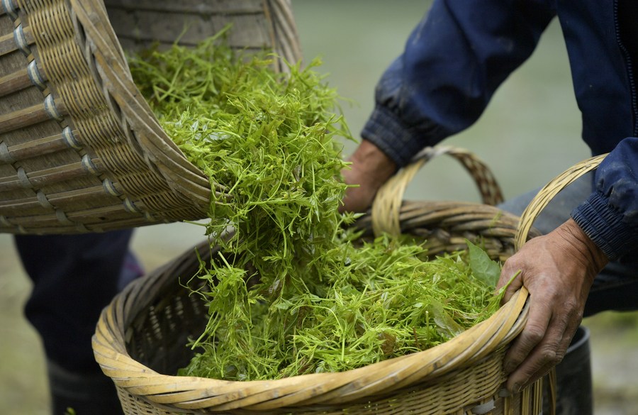 Workers transfer vine tea leaves in Laifeng County, central China's Hubei Province, May 23, 2018. Laifeng vine tea, made from vine leaves of ampelopsis plants, has been recognized as a national geographical indication product in 2013. (Xinhua/Song Wen)