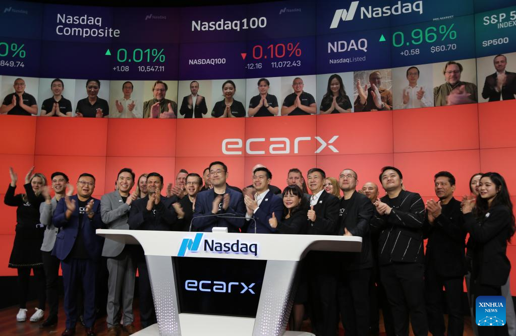 The management, shareholders and guests of ECARX Holdings attend a ceremony to ring the opening bell at Nasdaq in New York City, the United States, on Dec. 21, 2022. (Xinhua/Liu Yanan)