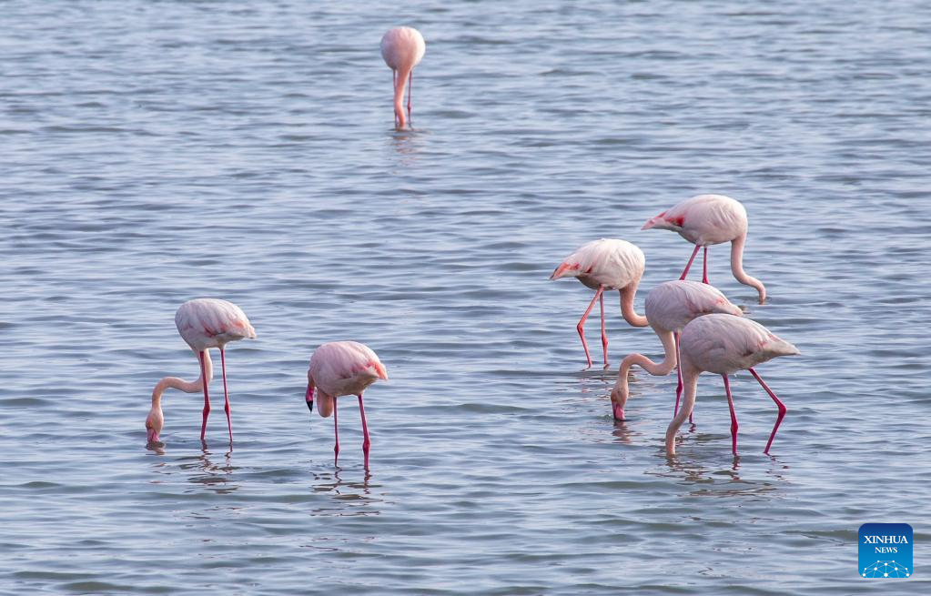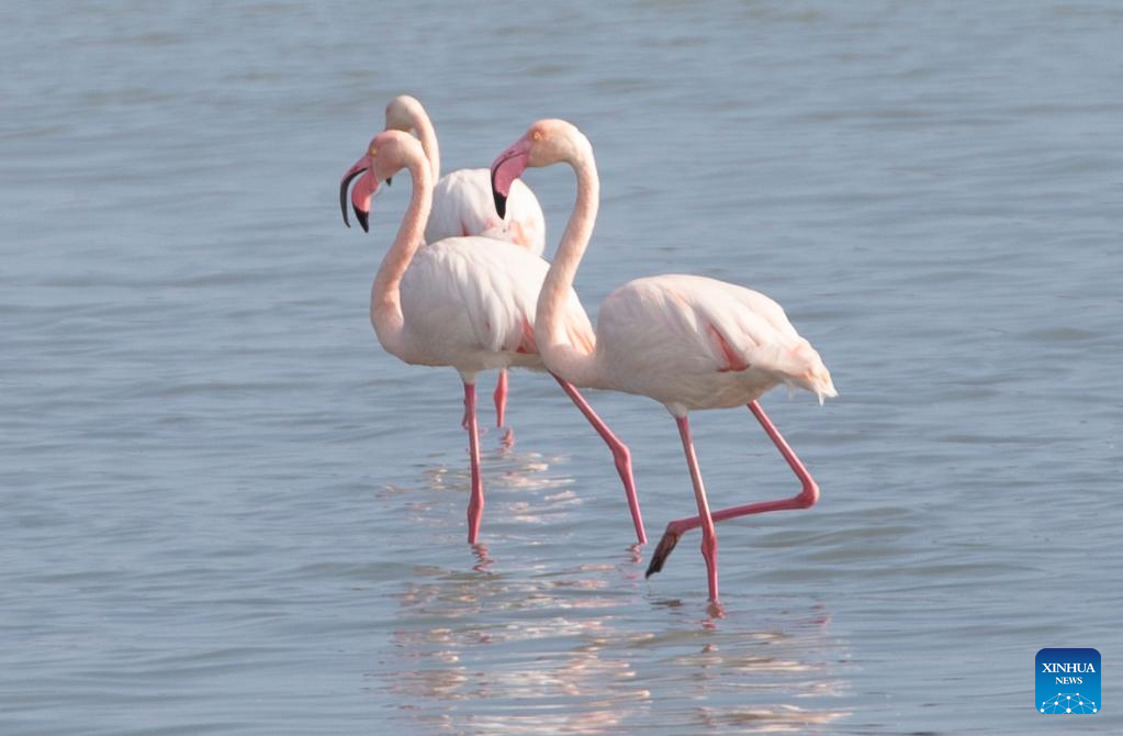 Flamingos are seen in Larnaca Salt Lake, Cyprus, Jan. 6, 2023. (Photo by George Christophorou/Xinhua)
