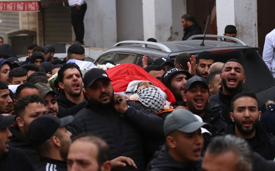 Mourners carry the body of Awni Aslan, killed early on Thursday during an Israeli raid, during his funeral in the West Bank refugee camp of Qalandia, on Jan. 12, 2023. (Photo by Nidal Eshtayeh/Xinhua)