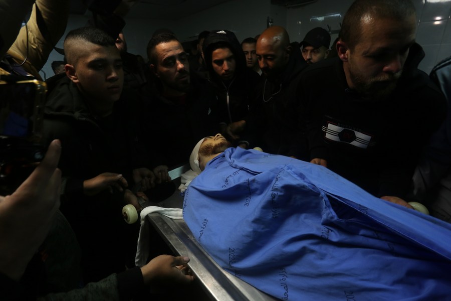 Palestinians gather around the body of Ahmad Abu Jneid, killed by Israeli soldiers in clashes, at a hospital in the West Bank city of Nablus, on Jan. 11, 2023. (Photo by Nidal Eshtayeh/Xinhua)