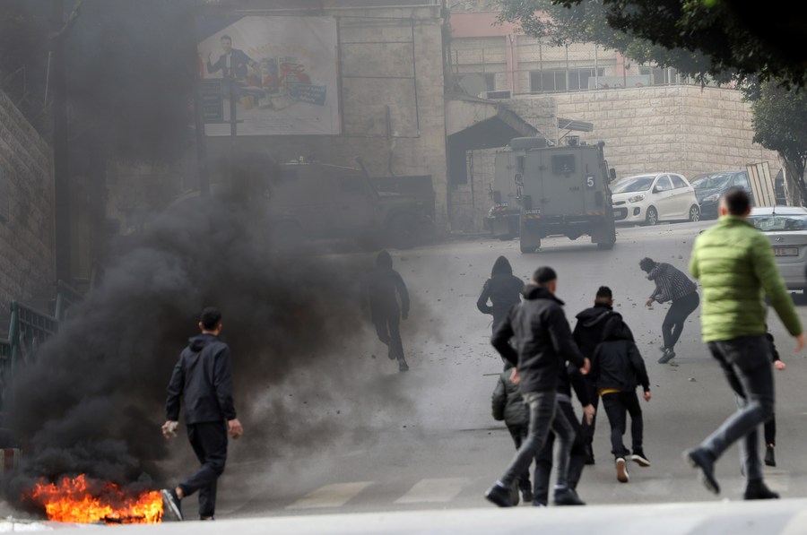 Palestinian protesters hurl stones at Israeli military vehicles during clashes in the West Bank city of Nablus, on Jan. 12, 2023. (Photo by Ayman Nobani/Xinhua)