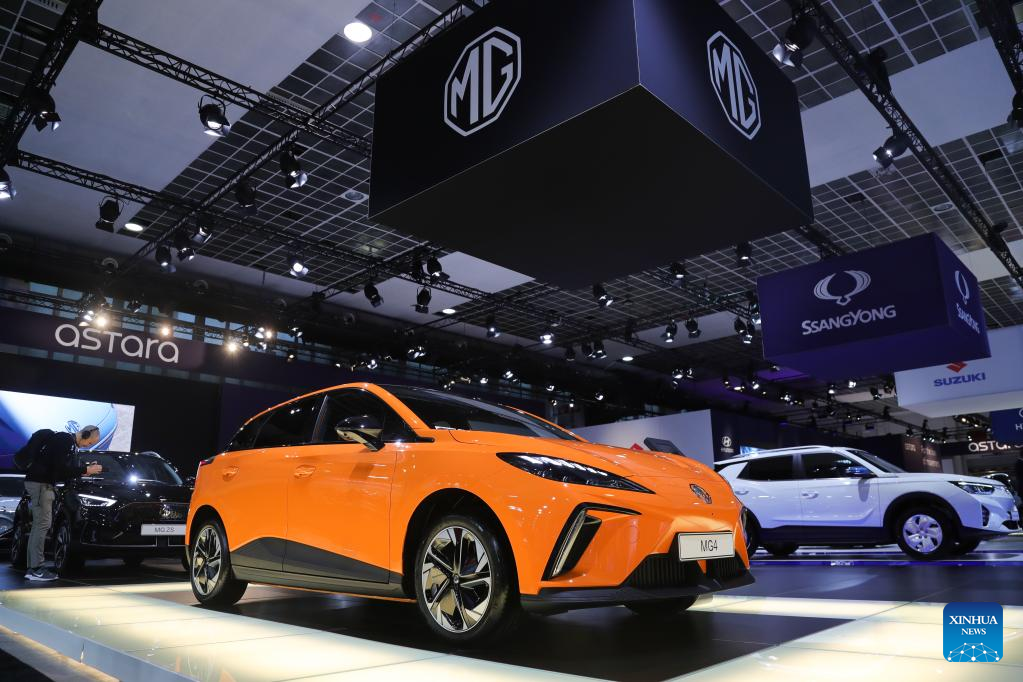A man takes videos at the exhibition area of MG during the press day of the 100th Brussels Motor Show in Brussels, Belgium, Jan. 13, 2023. The 100th Brussels Motor Show will be held here from Jan. 14 to 22. (Xinhua/Zheng Huansong)
