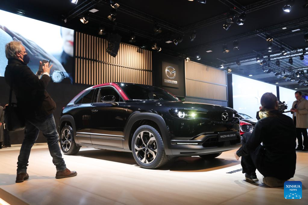 People view a Mazda MX-30 R-EV during the press day of the 100th Brussels Motor Show in Brussels, Belgium, Jan. 13, 2023. The 100th Brussels Motor Show will be held here from Jan. 14 to 22. (Xinhua/Zheng Huansong)