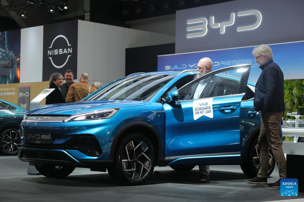 A man looks at a BYD Tang during the press day of the 100th Brussels Motor Show in Brussels, Belgium, Jan. 13, 2023. The 100th Brussels Motor Show will be held here from Jan. 14 to 22. (Xinhua/Zheng Huansong)