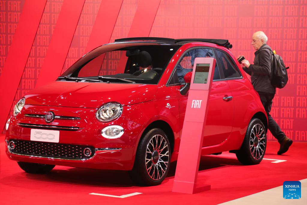 A man films a Fiat 500 Cabrio during the press day of the 100th Brussels Motor Show in Brussels, Belgium, Jan. 13, 2023. The 100th Brussels Motor Show will be held here from Jan. 14 to 22. (Xinhua/Zheng Huansong)