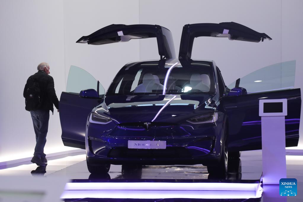 A man looks at a Tesla Model X during the press day of the 100th Brussels Motor Show in Brussels, Belgium, Jan. 13, 2023. The 100th Brussels Motor Show will be held here from Jan. 14 to 22. (Xinhua/Zheng Huansong)