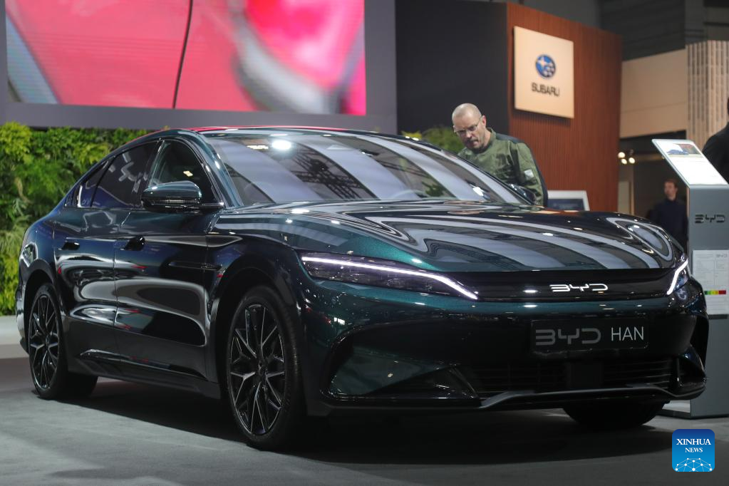 A man looks at a BYD Han during the press day of the 100th Brussels Motor Show in Brussels, Belgium, Jan. 13, 2023. The 100th Brussels Motor Show will be held here from Jan. 14 to 22. (Xinhua/Zheng Huansong)