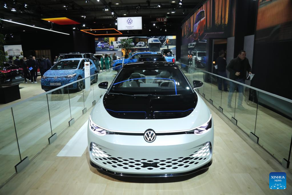 A Volkswagen ID. Space Vizzion concept car is seen during the press day of the 100th Brussels Motor Show in Brussels, Belgium, Jan. 13, 2023. The 100th Brussels Motor Show will be held here from Jan. 14 to 22. (Xinhua/Zheng Huansong)