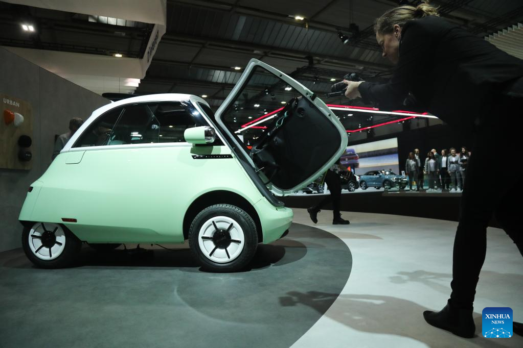 A woman takes photos of a Microlino electric bubble car during the press day of the 100th Brussels Motor Show in Brussels, Belgium, Jan. 13, 2023. The 100th Brussels Motor Show will be held here from Jan. 14 to 22. (Xinhua/Zheng Huansong)