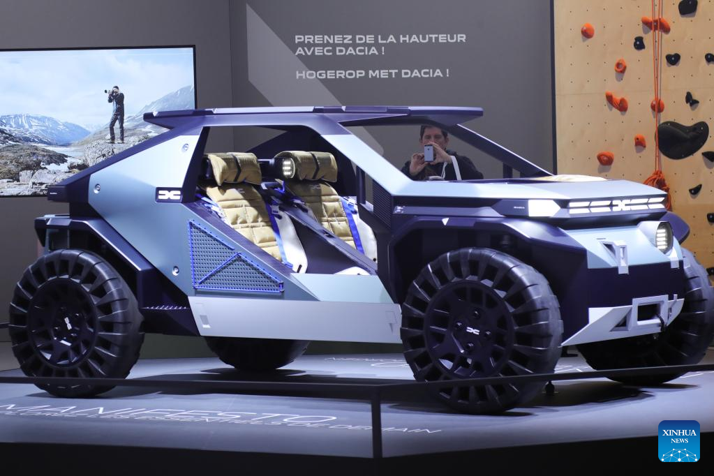 A man takes photos of a Dacia Manifesto concept car during the press day of the 100th Brussels Motor Show in Brussels, Belgium, Jan. 13, 2023. The 100th Brussels Motor Show will be held here from Jan. 14 to 22. (Xinhua/Zheng Huansong)