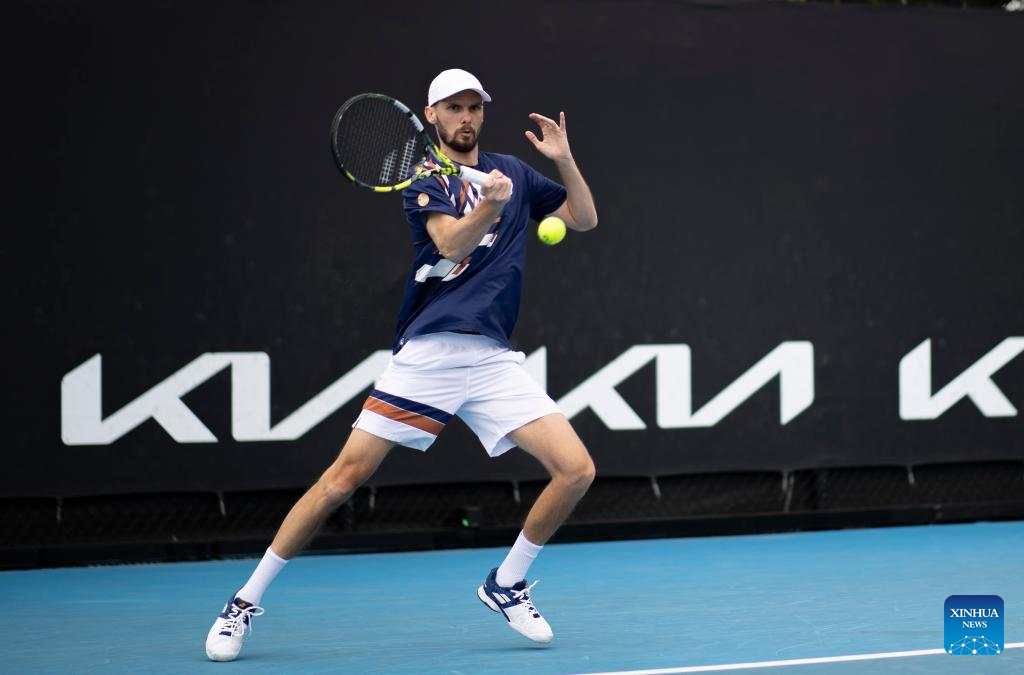 Oscar Otte of Germany hits a return during the men's single 1st round match against Shang Juncheng of China at Australian Open tennis tournament, in Melbourne, Australia, on Jan. 16, 2023. (Xinhua/Bai Xuefei)