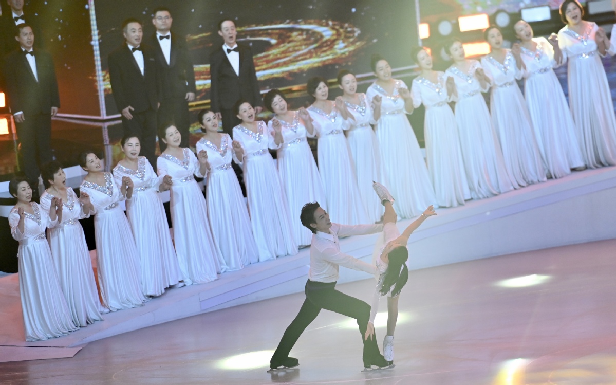 Pang Qing and Tong Jian perform ice dancing at the event. [Photo by Wei Xiaohao/China Daily]