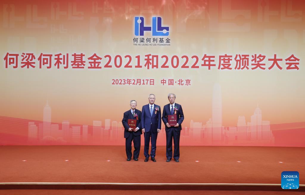 Chinese Vice Premier Liu He (C) poses for a photo with scientists Hu Side (L) and Lin Ming during an award ceremony held by the Hong Kong-based Ho Leung Ho Lee (HLHL) Foundation in Beijing, capital of China, Feb. 17, 2023. Liu He addressed the award ceremony, which was also attended by Ji Bingxuan, vice chairman of the National People's Congress Standing Committee, and Wan Gang, vice chairman of the National Committee of the Chinese People's Political Consultative Conference and chairman of the China Association for Science and Technology. Scientists Hu Side and Lin Ming were awarded achievement prizes by the foundation. (Xinhua/Wang Ye)