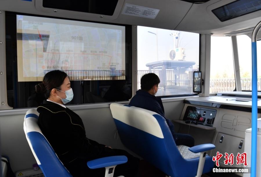 Staff members test a smart bus of line 901 in Xiongan New Area, north China's Hebei Province, Feb. 22, 2023. (Photo: China News Service/Han Bing)