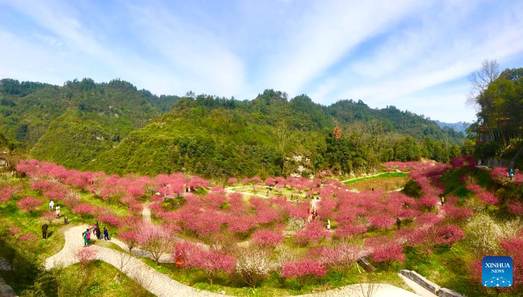 This photo taken on Feb. 20, 2022 shows plum blossoms in Chenjiapo Village of Yongshun County, central China's Hunan Province. (Photo by Yu Guanglong/Xinhua)