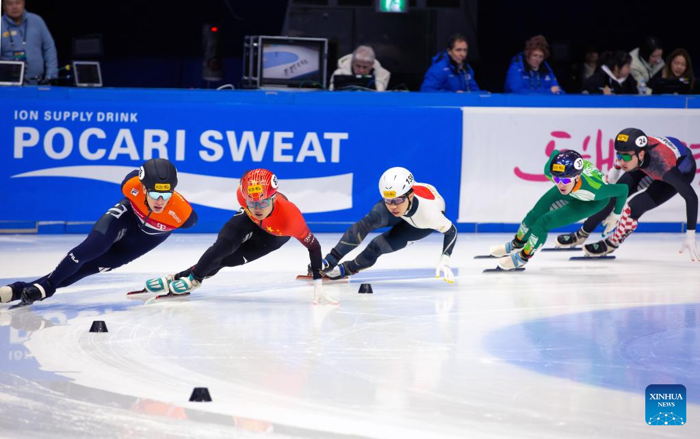 Jans van 'T Wout of the Netherlands, Li Wenlong of China, Iwasa Dan of Japan, Liam O Brien of Ireland and Martin Kolenc of Croatia (L to R) compete during the quarterfinals of men's 1500m at the ISU World Short Track Speed Skating Championships in Seoul, South Korea, March 10, 2023. (Xinhua/Wang Yiliang)