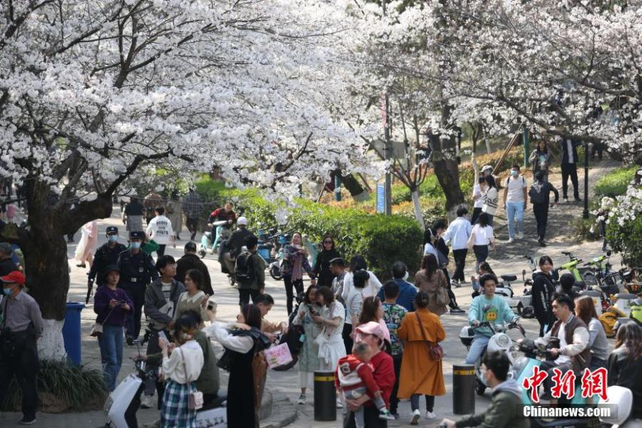 Visitors flock to Wuhan University to enjoy the cherry blossoms in central China's Hubei Province, March 15, 2023. (Photo: China News Service/Zhao Jun)