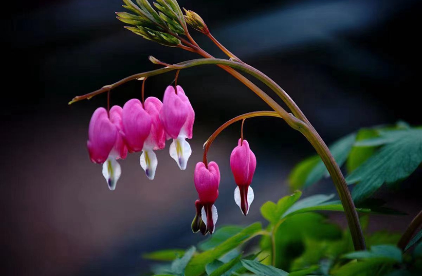 Photo shows blooming heart-shaped flowers of Asian bleeding-heart, a species of flowering plant that is commonly known as the “purse peony” in Luoyang city, central China’s Henan Province. (Photo courtesy of the publicity department of the Communist Party of China Luoyang municipal committee)