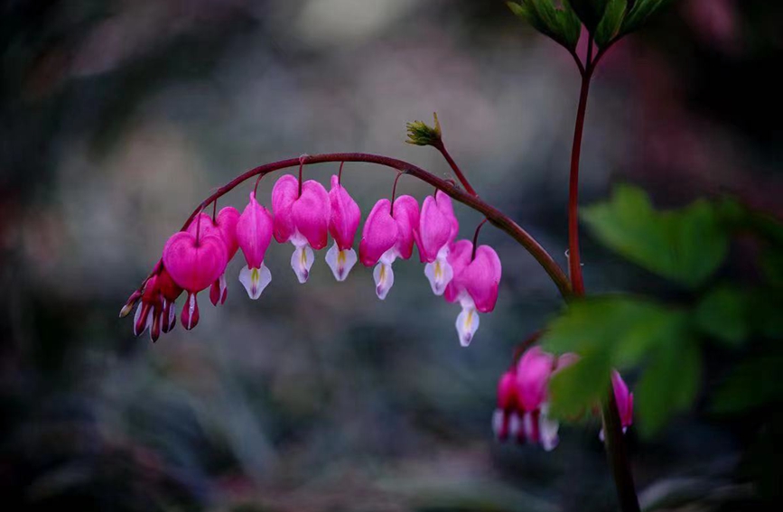 Photo shows blooming heart-shaped flowers of Asian bleeding-heart, a species of flowering plant that is commonly known as the “purse peony” in Luoyang city, central China’s Henan Province. (Photo courtesy of the publicity department of the Communist Party of China Luoyang municipal committee)