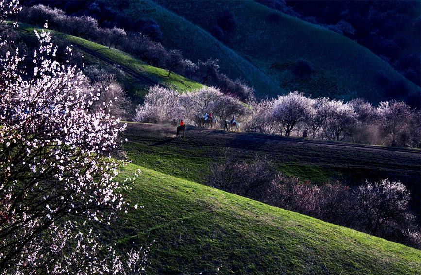 The green meadow and pink apricot flowers create a gorgeous spring view of Nalati Apricot Valley in Xinyuan county, northwest China's Xinjiang Uygur Autonomous Region. (Photo/Yang Xiaoqian)