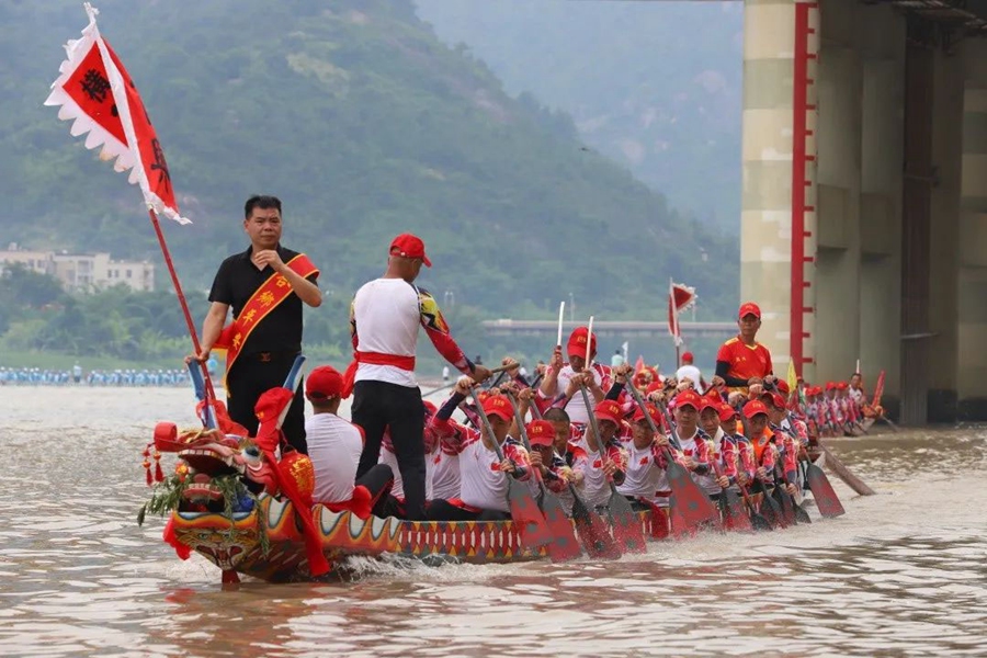 Contestants compete during a dragon boat friendship race held in Lianjiang county, Fuzhou city, southeast China's Fujian Province, June 18, 2023. (Photo courtesy of Media Convergence Center of Lianjiang county)