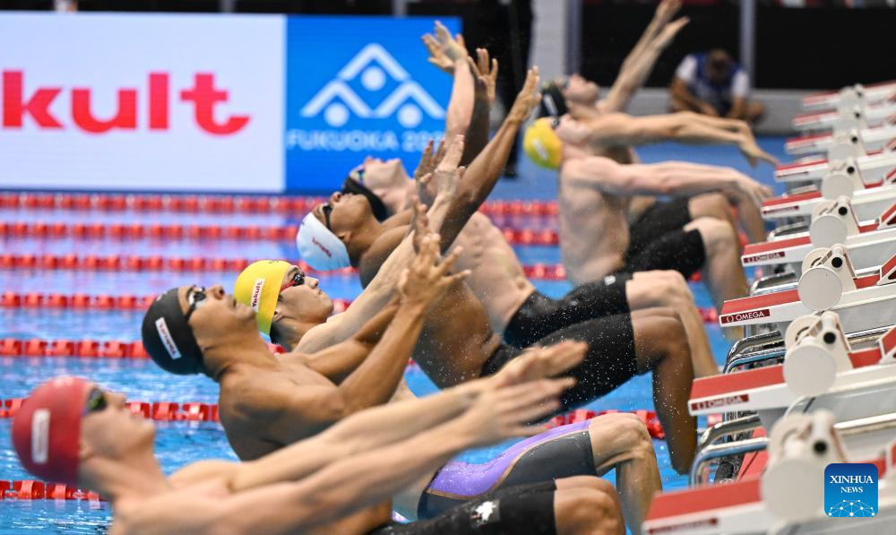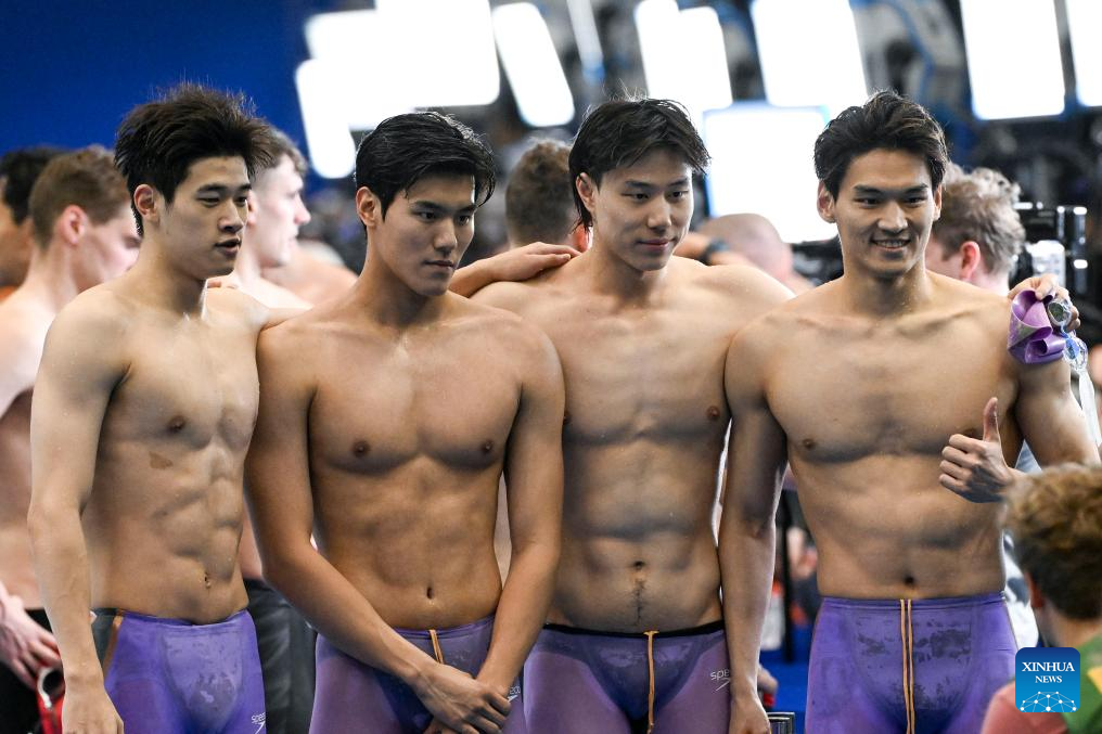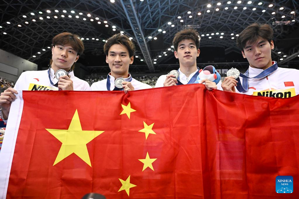 Xu Jiayu (3rd L) of China competes during the men's 4x100m medley relay final of swimming at the World Aquatics Championships in Fukuoka, Japan, July 30, 2023. (Xinhua/Xia Yifang)
