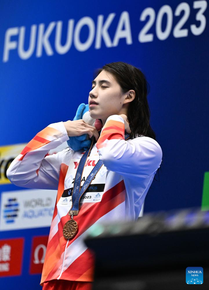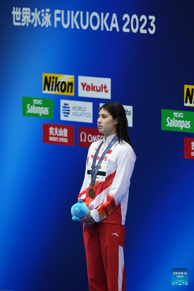 Zhang Yufei of China reacts during the medals ceremony for the women's 50m freestyle final of swimming at the World Aquatics Championships in Fukuoka, Japan, July 30, 2023. (Xinhua/Zhang Xiaoyu)
