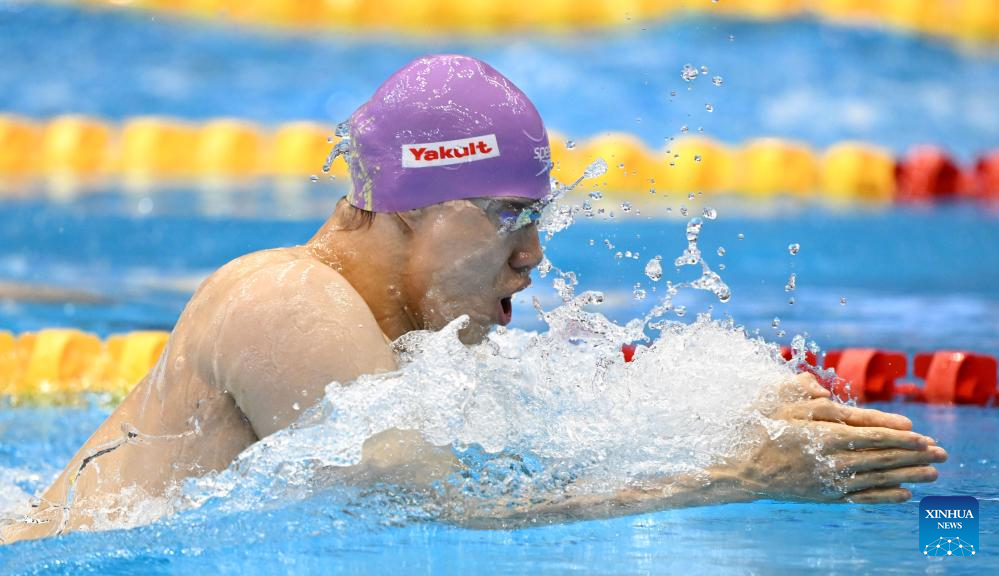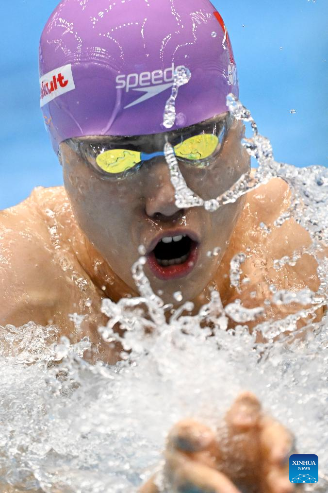 Qin Haiyang of China competes during the men's 4x100m medley relay final of swimming at the World Aquatics Championships in Fukuoka, Japan, July 30, 2023. (Xinhua/Xu Chang)
