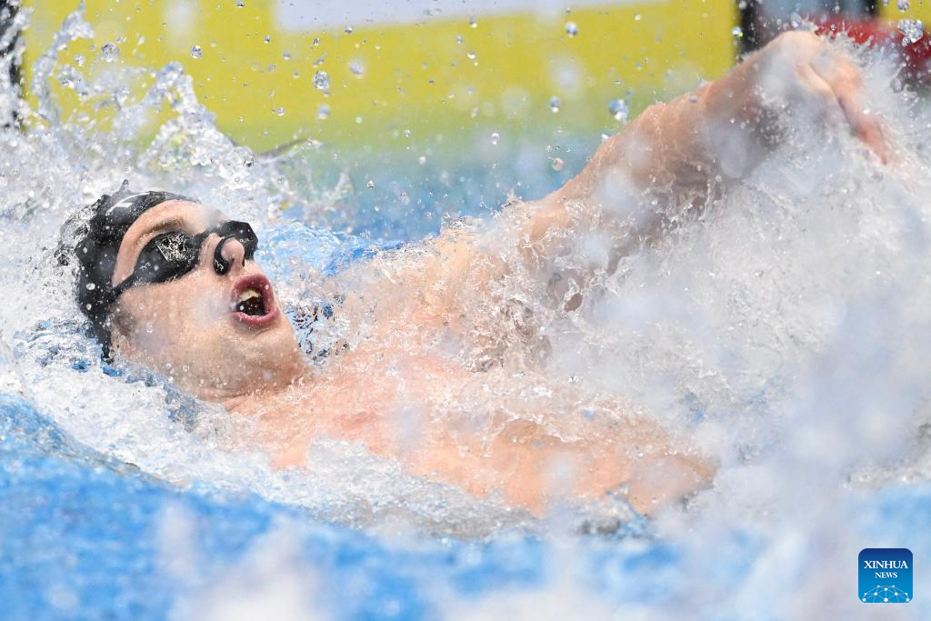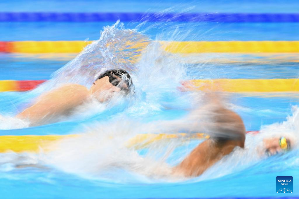 Bobby Finke (top) of the United States competes during the men's 1500m freestyle final of swimming at the World Aquatics Championships in Fukuoka, Japan, July 30, 2023. (Xinhua/Xu Chang)