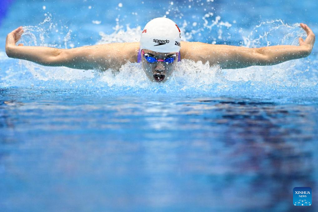 China's Zhang Yufei competes during the women's 4x100m medley relay final of swimming at the World Aquatics Championships in Fukuoka, Japan, July 30, 2023. (Xinhua/Xu Chang)