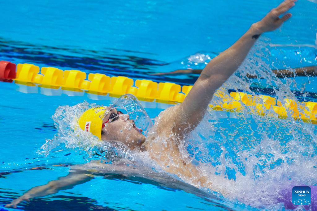 Xu Jiayu of China competes during the men's 50m backstroke final of swimming at the World Aquatics Championships in Fukuoka, Japan, July 30, 2023. (Xinhua/Xu Chang)