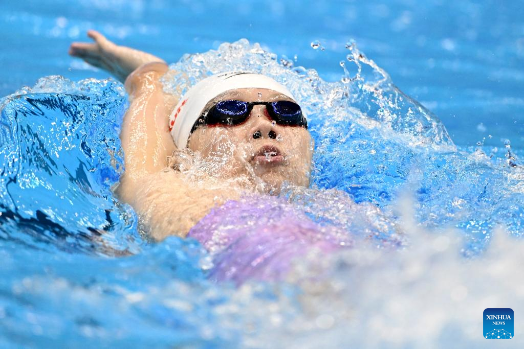 Wan Letian of China competes during the women's 4x100m medley relay final of swimming at the World Aquatics Championships in Fukuoka, Japan, July 30, 2023. (Xinhua/Xu Chang)