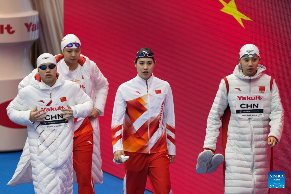 Wan Letian, Tang Qianting, Zhang Yufei and Cheng Yujie (L to R) of China react before the women's 4x100m medley relay final of swimming at the World Aquatics Championships in Fukuoka, Japan, July 30, 2023. (Xinhua/Zhang Xiaoyu)