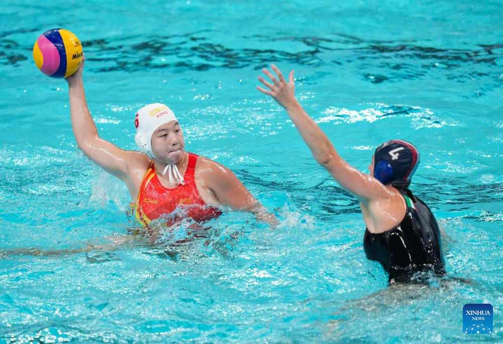 Wang Shiyun (C) of China vies with Cecilia Nardini (L) of Italy during the water polo women's gold medal match between China and Italy at the 31st FISU Summer World University Games in Chengdu, southwest China's Sichuan Province, Aug. 7, 2023. (Xinhua/Jiang Hongjing)