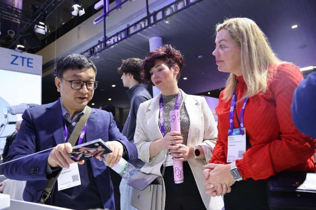 A staff member of Chinese tech firm ZTE introduces the latest product of the company at the Mobile World Congress 2024. (People's Daily/Yan Huan)