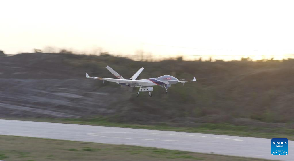The Wing Loong-2 large unmanned aerial vehicle (UAV) takes off from an airport in the city of Zigong, Southwest China's Sichuan province, March 18, 2024. [Photo/Xinhua]