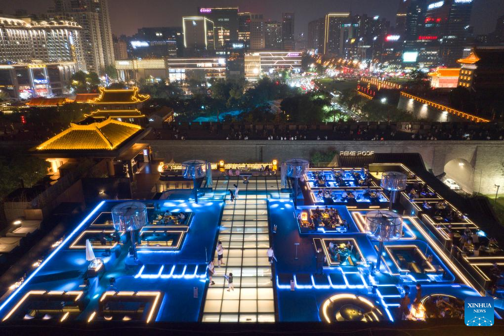 An aerial drone photo taken on Aug. 10, 2023 shows a bar near the south gate of ancient city wall of Xi'an, northwest China's Shaanxi Province. Xi'an, also known as Chang'an in ancient times, has a history stretching back over 3,100 years. Boasting world-famous sites such as the Terracotta Warriors, Xi'an served as the capital for 13 dynasties over the course of China's history. Today, tradition and modernity are intertwined in Xi'an, and its history is embedded within the hustle and bustle of urban life. (Xinhua/Shao Rui)