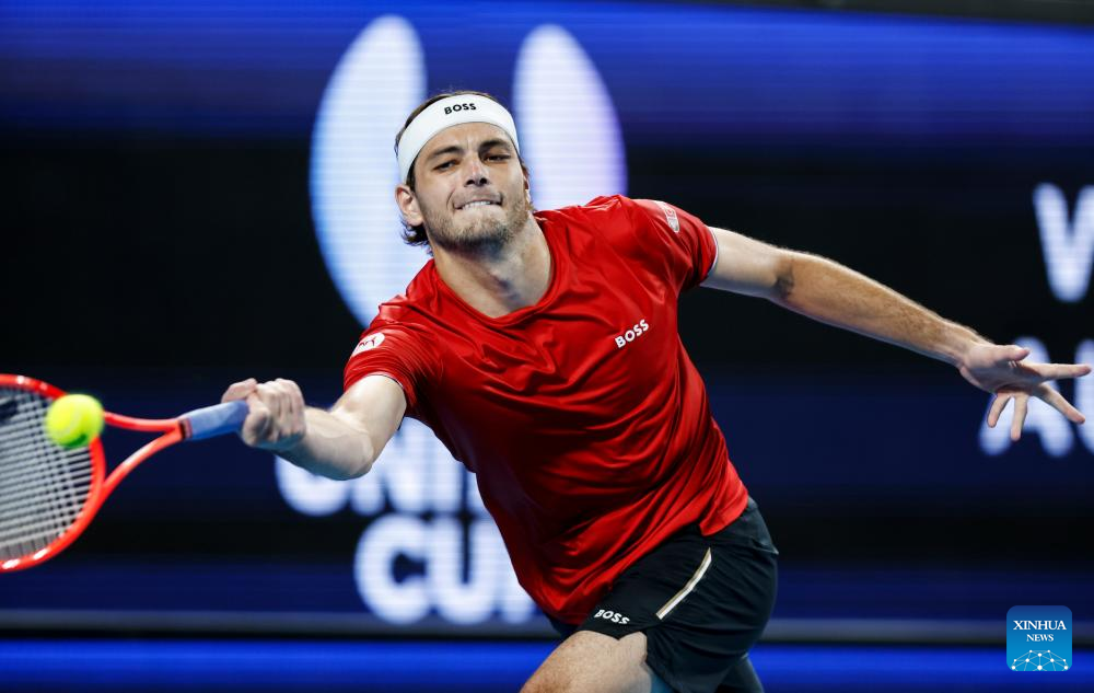 Taylor Fritz of the United States hits a return during the men's singles match against Zhang Zhizhen of China in the quarterfinal between China and the United States at the 2025 United Cup tennis tournament in Perth, Australia, Jan. 1, 2025. (Xinhua/Ma Ping)