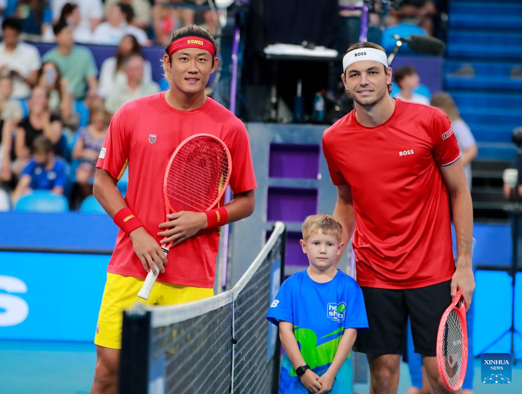 Taylor Fritz (R) of the United States poses for photos with Zhang Zhizhen of China before their men's singles match in the quarterfinal between China and the United States at the 2025 United Cup tennis tournament in Perth, Australia, Jan. 1, 2025. (Xinhua/Ma Ping)