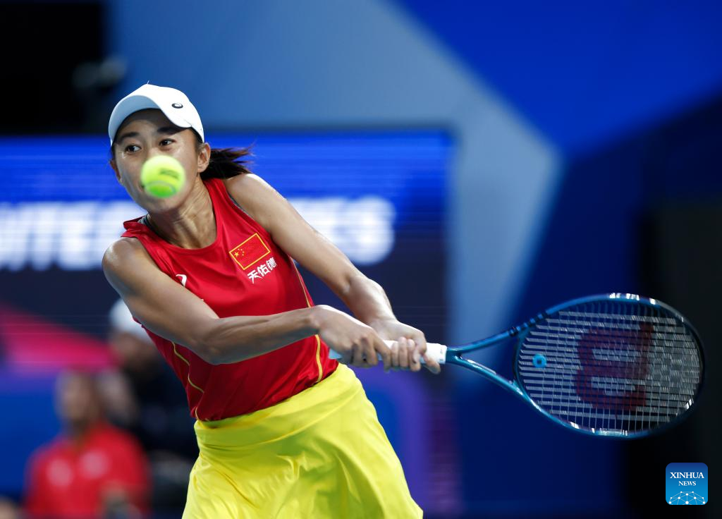Zhang Shuai of China hits a return during the women's singles match against Coco Gauff of the United States in the quarterfinal between China and the United States at the 2025 United Cup tennis tournament in Perth, Australia, Jan. 1, 2025. (Xinhua/Ma Ping)