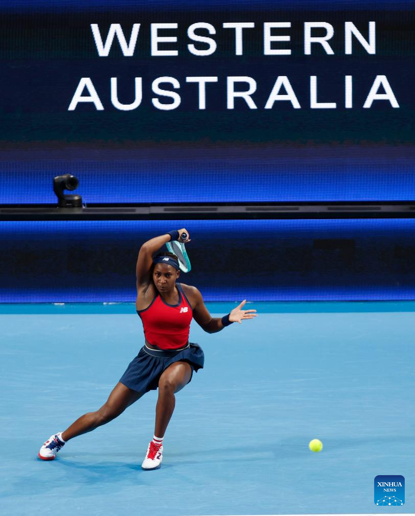 Coco Gauff of the United States hits a return during the women's singles match against Zhang Shuai of China in the quarterfinal between China and the United States at the 2025 United Cup tennis tournament in Perth, Australia, Jan. 1, 2025. (Xinhua/Ma Ping)