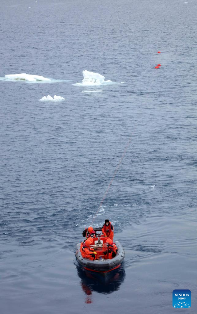 Members of China's 41st Antarctic expedition team work on a boat in the Amundsen Sea on Jan. 19, 2025. Chinese research icebreaker Xuelong 2, or Snow Dragon 2, is conducting a month-long marine ecosystem survey in the Amundsen Sea, which include a comprehensive investigation and monitoring of biological ecology, water, sedimentary and atmospheric environment, and pollutant distribution. Members of the expedition team decorated the vessel to greet the upcoming Spring Festival. (Xinhua/Huang Taoming)