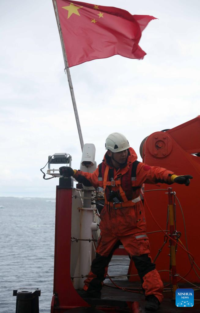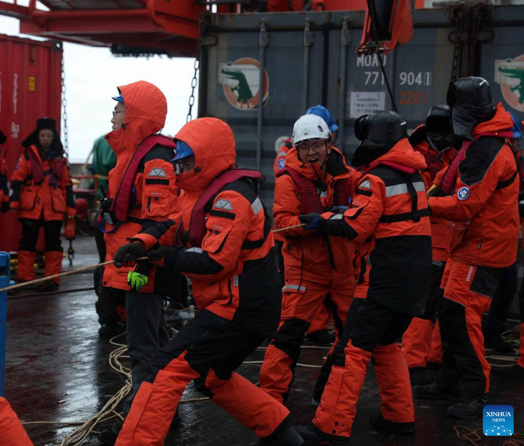 Members of China's 41st Antarctic expedition team prepare to deploy a Conductivity, Temperature, and Depth (CTD) instrument on Chinese research icebreaker Xuelong 2, Jan. 18, 2025. Chinese research icebreaker Xuelong 2, or Snow Dragon 2, is conducting a month-long marine ecosystem survey in the Amundsen Sea, which include a comprehensive investigation and monitoring of biological ecology, water, sedimentary and atmospheric environment, and pollutant distribution. Members of the expedition team decorated the vessel to greet the upcoming Spring Festival. (Xinhua/Huang Taoming)