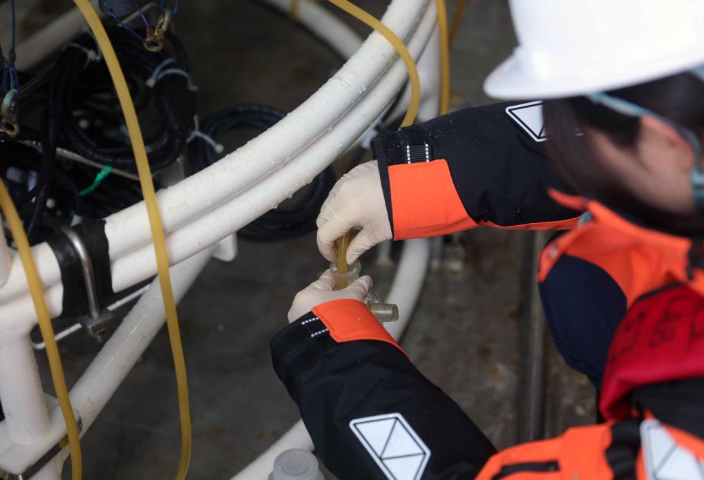 A member of China's 41st Antarctic expedition team collects water sample from a Conductivity, Temperature, and Depth (CTD) instrument on Chinese research icebreaker Xuelong 2, Jan. 18, 2025. Chinese research icebreaker Xuelong 2, or Snow Dragon 2, is conducting a month-long marine ecosystem survey in the Amundsen Sea, which include a comprehensive investigation and monitoring of biological ecology, water, sedimentary and atmospheric environment, and pollutant distribution. Members of the expedition team decorated the vessel to greet the upcoming Spring Festival. (Xinhua/Huang Taoming)